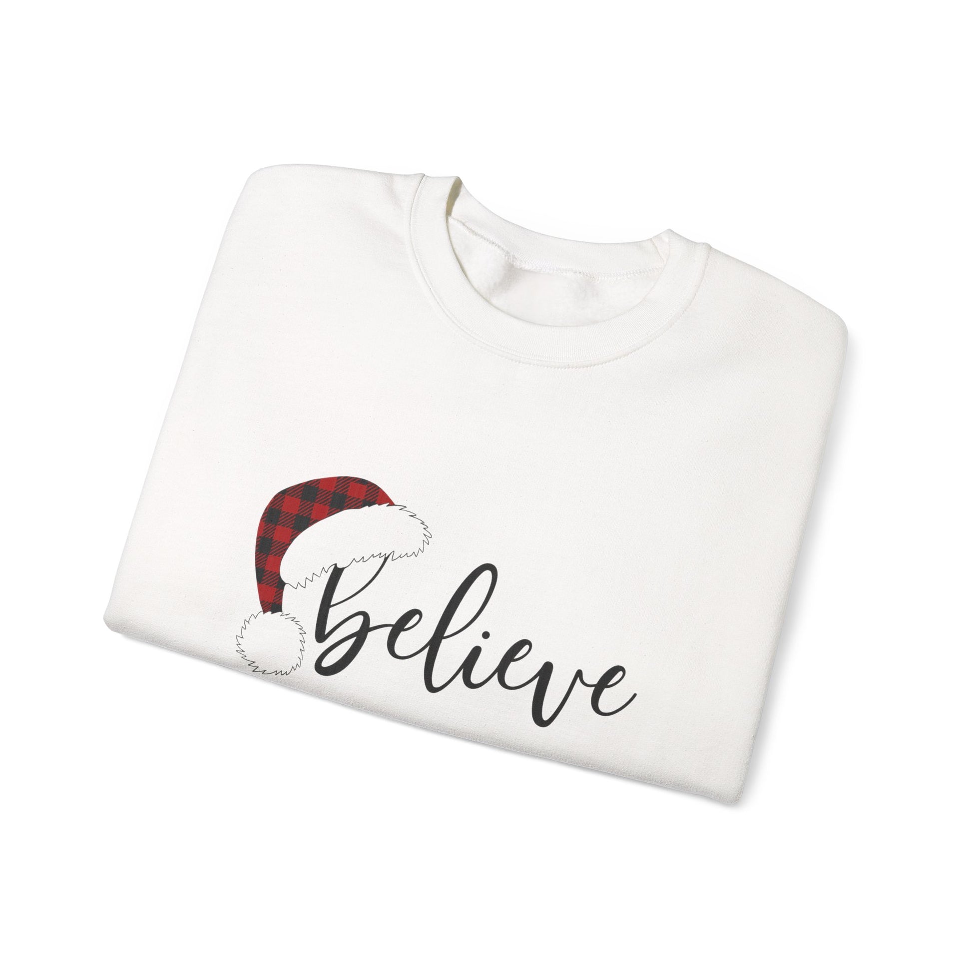 Unisex Heavy Blend™ mw2036 | Believe Christmas Sweatshirt – Buffalo Plaid Santa Hat Holiday Crewneck | Cozy Unisex Winter Gift